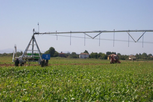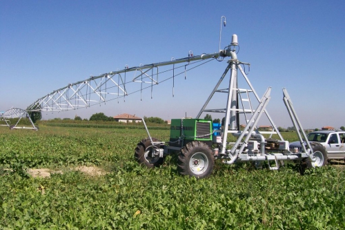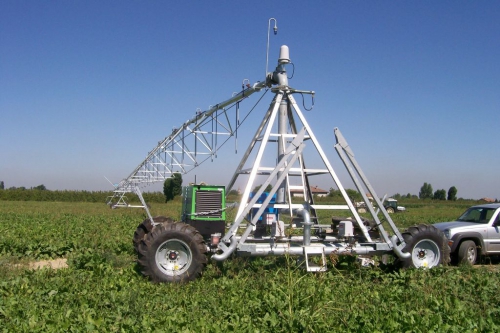 Macchine Semoventi (Rotoloni) I primi "rotoloni" costruiti in Italia risalgono agli anni 1974-1975, e per lo più furono realizzati da artigiani meccanici che già operavano nel settore dell'irrigazione agricola per l'installazione di impianti e pompe di vario tipo, copiando i primi prototipi francesi. Da allora, anche in Italia, si è assistito ad una rapida e costante diffusione di queste attrezzature. Per superfici di ragguardevoli dimensioni, per colture di secondo raccolto e per l’irrigazione di soccorso, il rotolone è, in molte situazioni aziendali, la migliore scelta tecnico-economica. Il rotolone rappresenta quindi un’evoluzione meccanica del metodo irriguo a pioggia ad ali mobili, rispetto alle quali offre: Gruppi motopompa L’irrigatore semovente di dimensioni più usuali in campagna (90-125 mm) comporta l’impiego di un gruppo motopompa in grado di erogare una notevole quantità d’acqua a elevata pressione.E’ opportuno quindi predisporre una attrezzatura pompante con elevate caratteristiche di prevalenza manometrica generalmente fornite da gruppi assemblati. Pivot (Ali imperniate) Il sistema di irrigazione con sistema PIVOT con tubazione rigida è particolarmente adatto per l’irrigazione di grandi superficie ma l’adattabilità dei modelli disponibili rende conveniente questo tipi di impianto anche per piccole superficie ( 4-5 Ha ) e per appezzamenti irregolari offrendo quindi la possibilità di scegliere al meglio la soluzione piu adatta alle singole esigenze. Rainger (Ali traslanti) Sempre con un tubazione rigida funziona il sistema rainger, in cui il movimento dei tralicci avviene in senso frontale. Diversamente dal precedente, l'area irrigata ha forma rettangolare e non circolare. Questi impianti possono essere dotati di valvole programmate e di programmatori d'irrigazione, per ridurre ulteriormente l'intervento della manodopera. Le grandi macchine semoventi presentano numerosi vantaggi funzionali, quali: